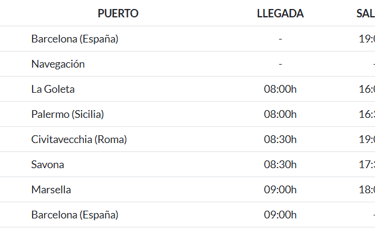 Pero la verdadera magia comienza al desembarcar. Cada escala es una puerta a la historia y la belleza: siente la esencia ancestral de La Goleta, piérdete por las bulliciosas calles de Palermo(Sicilia) , respira la grandeza eterna cerca de Civitavecchia, el puerto de Roma, y déjate seducir por el encanto histórico de Savona y Marsella. Ocho días para coleccionar sabores, paisajes y sonrisas. No es solo un crucero, es la escapada perfecta que combina exploración cultural, relax absoluto y la inigualable dolce vita italiana sobre el mar. ¡Tu aventura mediterránea te espera!