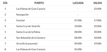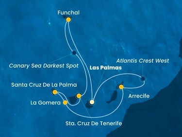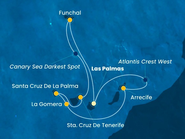 Con paradas en Las Palmas de Gran Canaria, Funchal, Santa Cruz de Tenerife, Santa Cruz de la Palma, San Sebastián de la Gomera, Arrecife (Lanzarote) y Las Palmas de Gran Canaria, donde podrás descubrir su arte y su exquisita gastronomía además de calas cristalinas y un centro histórico encantador—, este itinerario está diseñado para quienes buscan experiencias auténticas, cultura, sol y mar.