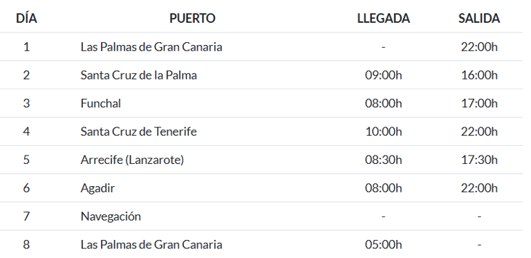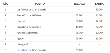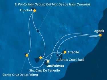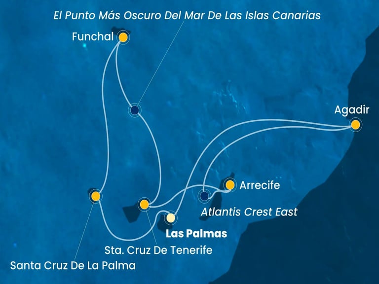 Cada puerto te ofrece una experiencia distinta: en La Palma descubrirás bosques verdes y miradores sobre antiguos cráteres; en Funchal, las flores, los vinos y los paisajes montañosos te envolverán en un ambiente único; en Tenerife, podrás visitar el majestuoso Teide o pasear por el encantador casco histórico de La Laguna; Lanzarote te sorprenderá con sus paisajes volcánicos dignos de otro planeta, y en Agadir, los aromas del zoco y la calidez marroquí pondrán un toque exótico a tu viaje.