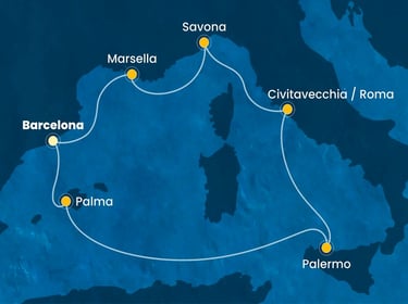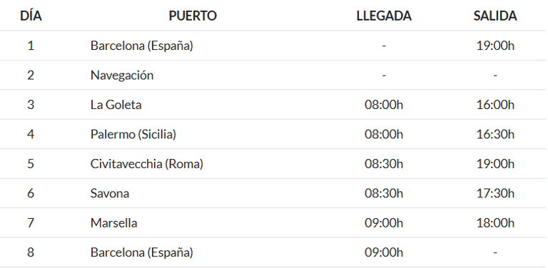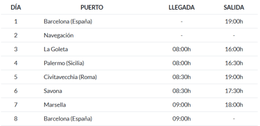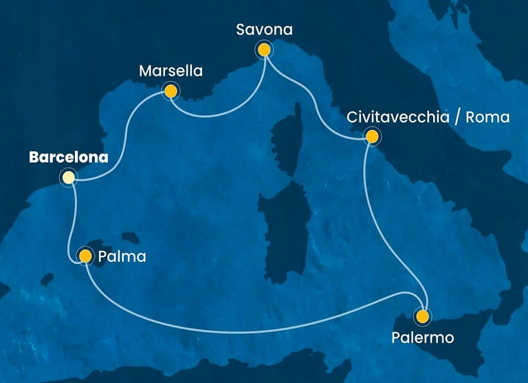Pero la verdadera magia comienza al desembarcar. Cada escala es una puerta a la historia y la belleza: siente la esencia ancestral de La Goleta, piérdete por las bulliciosas calles de Palermo(Sicilia) , respira la grandeza eterna cerca de Civitavecchia, el puerto de Roma, y déjate seducir por el encanto histórico de Savona y Marsella. Ocho días para coleccionar sabores, paisajes y sonrisas. No es solo un crucero, es la escapada perfecta que combina exploración cultural, relax absoluto y la inigualable dolce vita italiana sobre el mar. ¡Tu aventura mediterránea te espera!