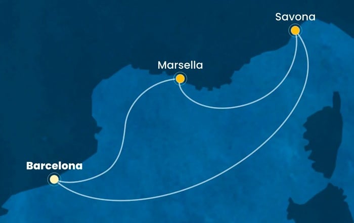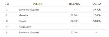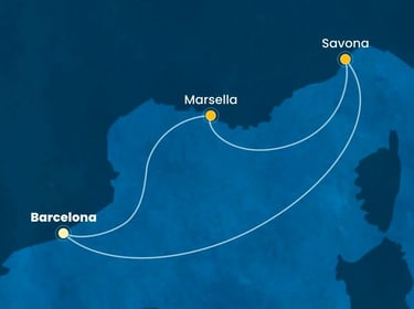 La primera escala te lleva a Marsella, ciudad portuaria que combina la modernidad francesa con la historia mediterránea. Su viejo puerto, los mercados llenos de aromas y colores, y la mezcla de culturas te harán sentir el pulso auténtico de la Provenza. Luego, el barco se dirige a Savona (Italia), un puerto tranquilo donde la tradición marinera y las plazas soleadas crean un escenario perfecto para pasear, descubrir cafés y sumergirse en la calidez italiana. Entre cada puerto, la navegación se convierte en un respiro: desde la cubierta puedes observar el mar que cambia de tonalidad, escuchar el viento y sentirte parte del vaivén de las olas.