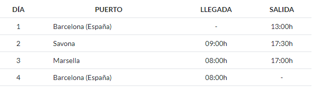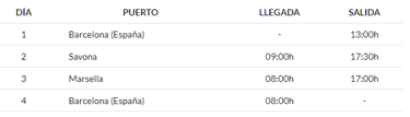 La aventura comienza en Barcelona, donde embarcas a las 13:00 h. La primera escala te lleva a Savona (Italia), un destino costero encantador con playas, patrimonio, iglesias y rincones para recorrer caminando al ritmo italiano. Luego pondrás rumbo a Marsella (Francia), ciudad portuaria llena de historia, desde su Viejo Puerto hasta la imponente basílica de Notre-Dame de la Garde. Tras tus exploraciones, el Costa Favolosa regresa hacia Barcelona para completar la travesía.