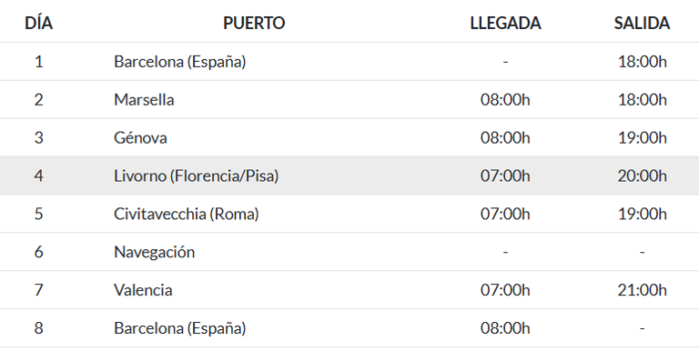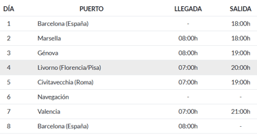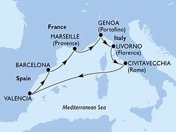 Embarca en el MSC Orchestra para disfrutar de un recorrido de 8 días y 7 noches por algunos de los destinos más emblemáticos del Mediterráneo Occidental. Con salida y regreso en Barcelona (España), este itinerario te llevará a descubrir Marsella (Francia), Génova, Livorno (Florencia/Pisa), Civitavecchia (Roma), Nápoles y Valencia, antes de volver al punto de partida.