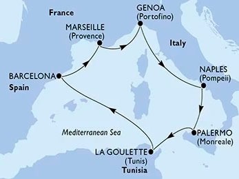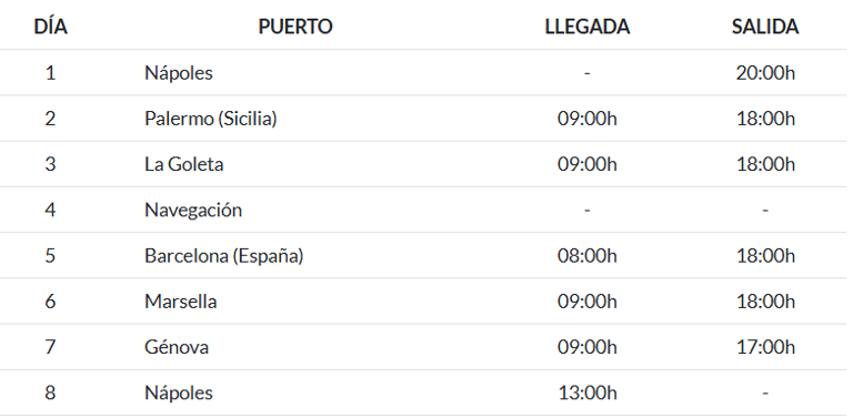 El itinerario te regala paradas imperdibles: Palermo (Sicilia), con su mezcla de estilos y sabores; La Goulette (Túnez), que abre la puerta a mercados exóticos y un Mediterráneo diferente; jornadas de navegación para desconectar en cubierta; Barcelona, vibrante y cosmopolita; Marsella, con su puerto antiguo y gastronomía mediterránea; y Génova, cuna de historia y callejuelas por descubrir. El broche lo pone el regreso a Nápoles, con el corazón lleno de recuerdos y la maleta repleta de experiencias.