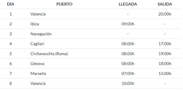 Cada destino suma una experiencia distinta: Ibiza con su ambiente isleño, Cagliari con su mezcla de mar y cultura sarda, Roma con su legado eterno, Génova con su tradición marítima y Marsella con su sabor francés mediterráneo. La tarifa incluye pensión completa, cuota de servicio (propinas) y tasas portuarias, ofreciendo una experiencia sin sobresaltos.
