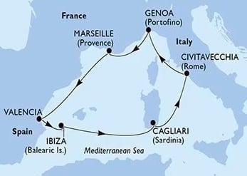 Zarpa desde Valencia en un crucero de 8 días y 7 noches a bordo del elegante MSC Musica, con una experiencia diseñada para quienes desean combinar islas, ciudades históricas y días de navegación en el Mediterráneo. El recorrido te lleva a Ibiza, luego un día de navegación para descansar y disfrutar del barco, seguido de escalas en Cagliari (Cerdeña), Civitavecchia (puerta de Roma), Génova y Marsella, antes de regresar a Valencia.