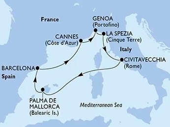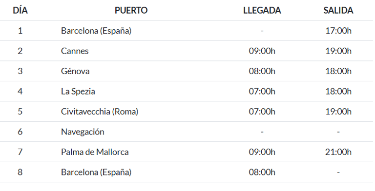 El segundo día te llevará a Cannes, donde el glamour se respira en su paseo marítimo, boutiques y vistas sobre la riviera. En Génova, descubrirás rincones empedrados, puertos antiguos y gastronomía italiana de verdad, mientras la historia naval late en cada calle. Luego llegas a La Spezia, puerta a la Toscana, donde Florencia y Pisa te harán soñar con arte, cúpulas y miradores. En Civitavecchia, tendrás Roma a tiro: monumentos eternos, plazas vibrantes y esa atmósfera que mezcla lo clásico y lo cotidiano. Después, un día de navegación para reconectarte con el océano, liberar la mente, disfrutar de spas, piscinas al aire libre, del teatro y de las cubiertas al atardecer. En Palma de Mallorca te espera sol, mar y paseo costero, callejuelas y ambiente relajado antes de volver a Barcelona para terminar este viaje con el alma llena de recuerdos.