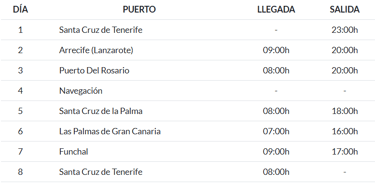 Después vendrá un día completo de navegación para que aproveches al máximo las comodidades del barco: piscinas, spa, espectáculos y deliciosas propuestas gastronómicas. Continuarás hacia Santa Cruz de La Palma, con sus calles empinadas, balcones floridos y cultura local que te atrapará. La ruta sigue hacia Las Palmas de Gran Canaria, donde monumentos como la Casa de Colón o el Jardín Botánico te esperan. Luego conocerás Funchal (Madeira), con sus jardines, mercado de agricultores y vistas montañosas, antes de regresar a Tenerife.