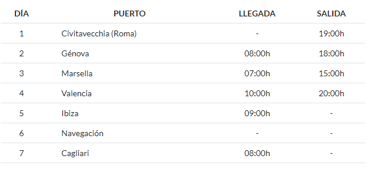 Tu travesía incluye escalas en Génova, con su puerto antiguo y callejuelas cargadas de encanto; Marsella, la ciudad francesa con sabor mediterráneo y rincones pintorescos; Valencia, vibrante y moderna, con historia y playas a la vez; Ibiza, famosa por su ambiente festivo y calas idílicas; un día de navegación para desconectar y disfrutar de todo lo que el barco ofrece; y finalmente Cagliari (Cerdeña), con su mezcla de historia, costa y autenticidad italiana. El reembarque concluye en Roma, completando un viaje redondo.