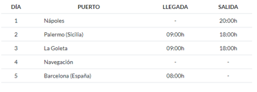Este crucero de 5 días y 4 noches parte del puerto de Nápoles, e incluye escalas en Palermo (Sicilia), La Goleta (Túnez), un día de navegación para vivir el encanto del mar abierto y finaliza en Barcelona (España). En este viaje, cada puerto combina raíces antiguas, sabores exóticos y paisajes mediterráneos.