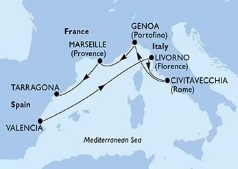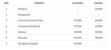 Cada escala es una invitación al descubrimiento: en Livorno podrás adentrarte en la Toscana y visitar ciudades renacentistas como Florencia o Pisa; en Civitavecchia, estarás cerca de Roma, donde el Coliseo, el Vaticano y las plazas eternas te esperan; en Génova, callejones antiguos, puertos históricos y tradición marítima te cautivarán; en Marsella, cultura, sabores y el viejo puerto se funden en una experiencia mediterránea vibrante; finalmente, en Tarragona, huellas romanas, playas y encanto catalán se mezclan antes del regreso a Valencia.