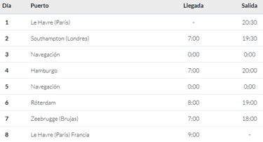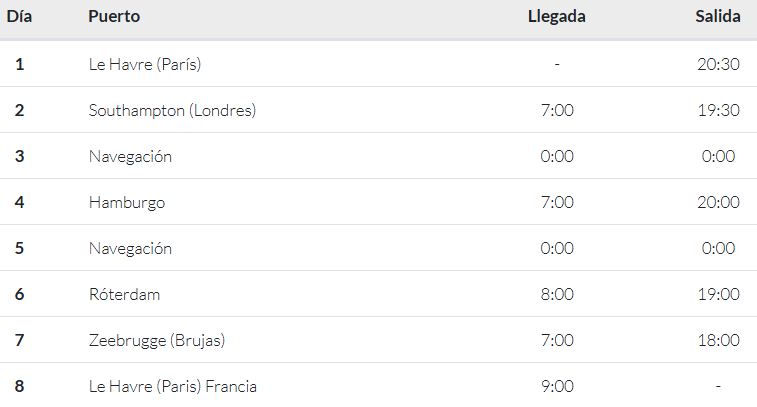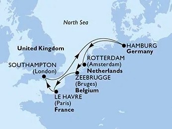 El MSC Poesía te invita a aventurarte en una travesía de 8 días y 7 noches. Zarparás des de Le Havre (París), Un lugar con un rico contenido histórico y belleza, llegando a Southampton (Londres) un puerto clave para llegar a la fantástica Londres, después de un día de navegación llegarás a Hamburgo donde se encuentra el Museo Marítimo. Llegando al final de este viaje pasaremos por Róterdam y Zeebrugg (Brujas) y finalmente regresaremos a Le Havre (Paris)
