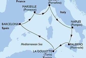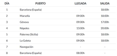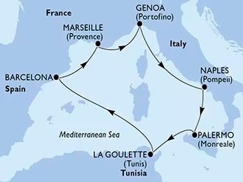 Tu travesía comienza en la vibrante Barcelona, punto de partida ideal para unas vacaciones inolvidables. Desde allí, el barco pone rumbo a Marsella (Francia), donde podrás explorar su puerto viejo, las calles con encanto y su gastronomía mediterránea. El siguiente destino es Génova (Italia), cuna de Cristóbal Colón y famosa por su casco histórico, seguido de Nápoles, donde te espera la imponente vista del Vesubio y la magia de Pompeya.