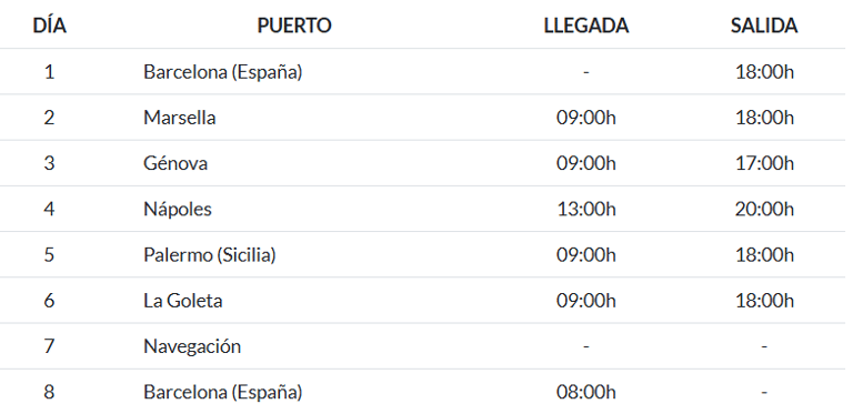 La ruta continúa hacia Palermo (Sicilia), una joya italiana repleta de historia, cultura árabe-normanda y delicias culinarias. Después visitarás La Goulette (Túnez), donde podrás disfrutar de los zocos tradicionales y la arquitectura árabe antes de llegar a Civitavecchia (Roma), una parada ideal para descubrir la Ciudad Eterna. Finalmente, regresarás a Barcelona, con el corazón lleno de recuerdos y nuevas emociones.
